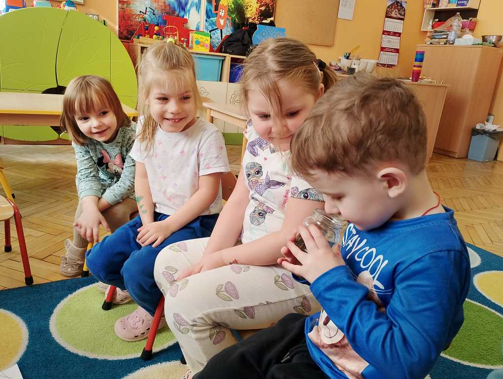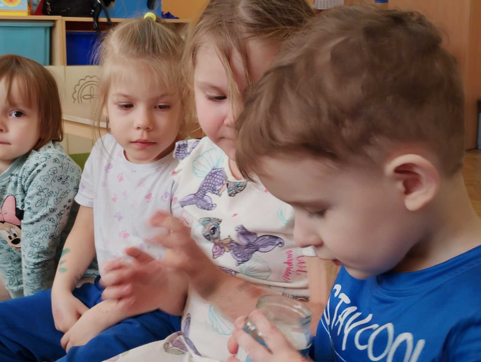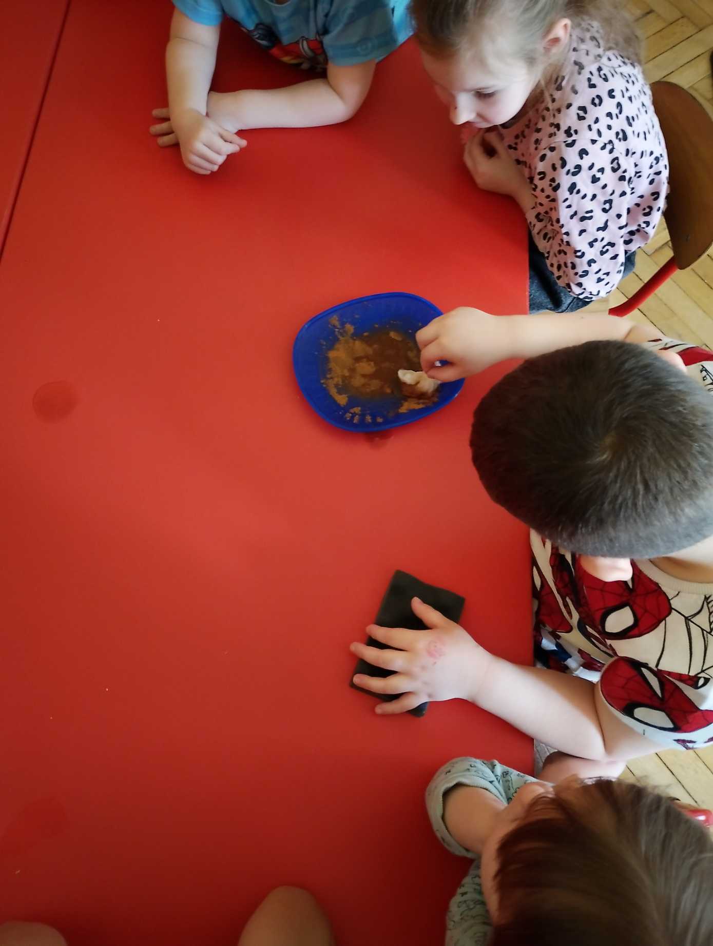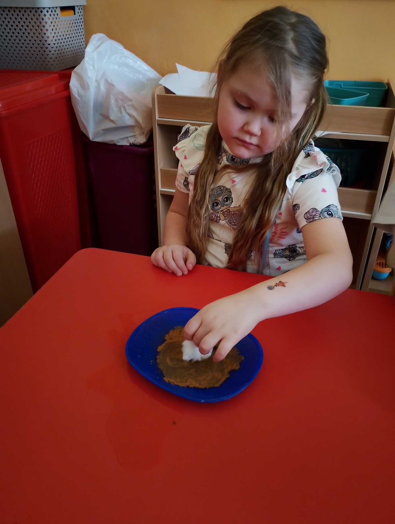 W tym tygodniu dzieci w grupie średniaków poznawały przedmioty 5 zmysłami (wzrok, słuch, smak, dotyk, węch). Bawiły się w poznawanie przedmiotów tylko za pomocą dotyku, opisując także właściwości rzeczy (miękki, twardy, szorstki, gładki). Ciocia Agnieszka przyniosła też przyprawy (cynamon, pieprz, kawa, sól) oprócz poznania ich za pomocą zmysłów, dzieci oglądały też eksperymenty przy użyciu tych przypraw. Dzieci by utrwalić temat wykonały prace plastyczną korzystając z pomponów, gąbki, bibuły oraz kawy i cynamonu.
