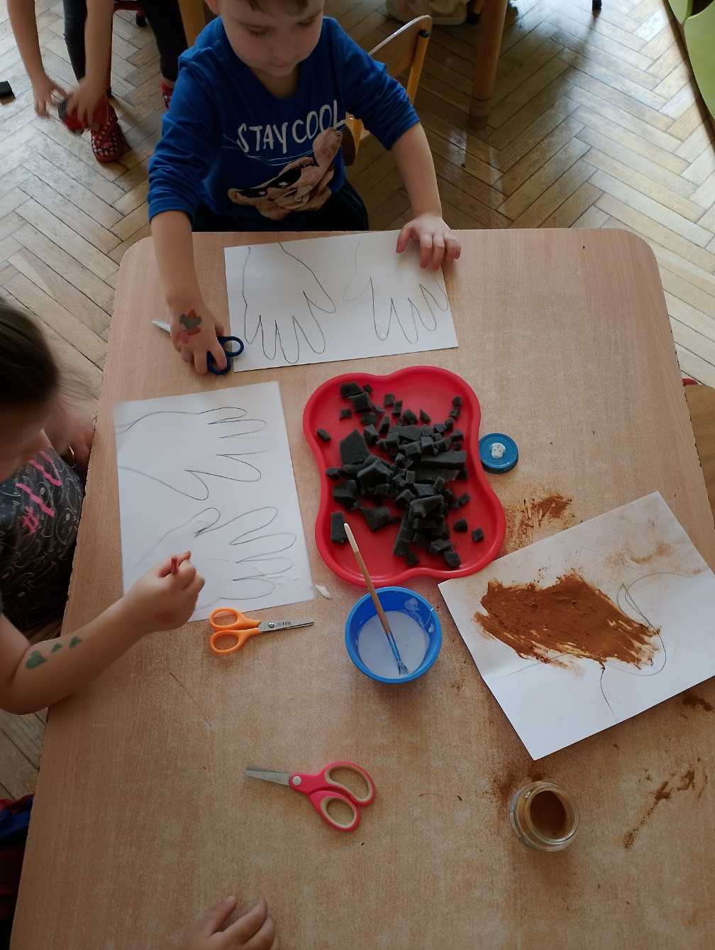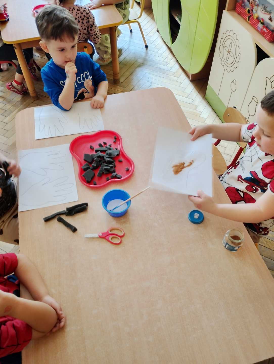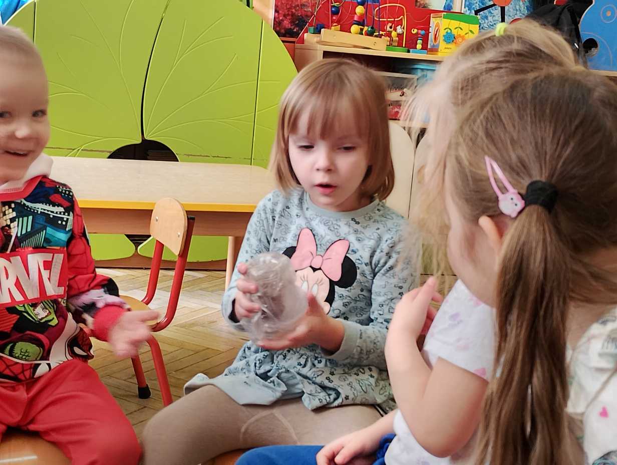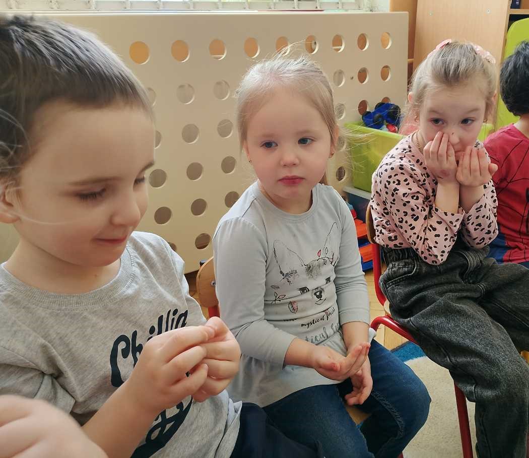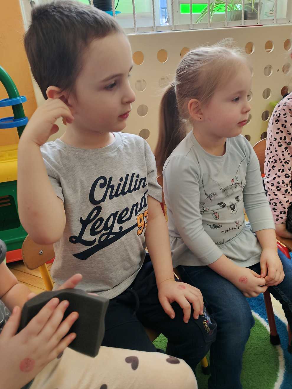 W tym tygodniu dzieci w grupie średniaków poznawały przedmioty 5 zmysłami (wzrok, słuch, smak, dotyk, węch). Bawiły się w poznawanie przedmiotów tylko za pomocą dotyku, opisując także właściwości rzeczy (miękki, twardy, szorstki, gładki). Ciocia Agnieszka przyniosła też przyprawy (cynamon, pieprz, kawa, sól) oprócz poznania ich za pomocą zmysłów, dzieci oglądały też eksperymenty przy użyciu tych przypraw. Dzieci by utrwalić temat wykonały prace plastyczną korzystając z pomponów, gąbki, bibuły oraz kawy i cynamonu.
