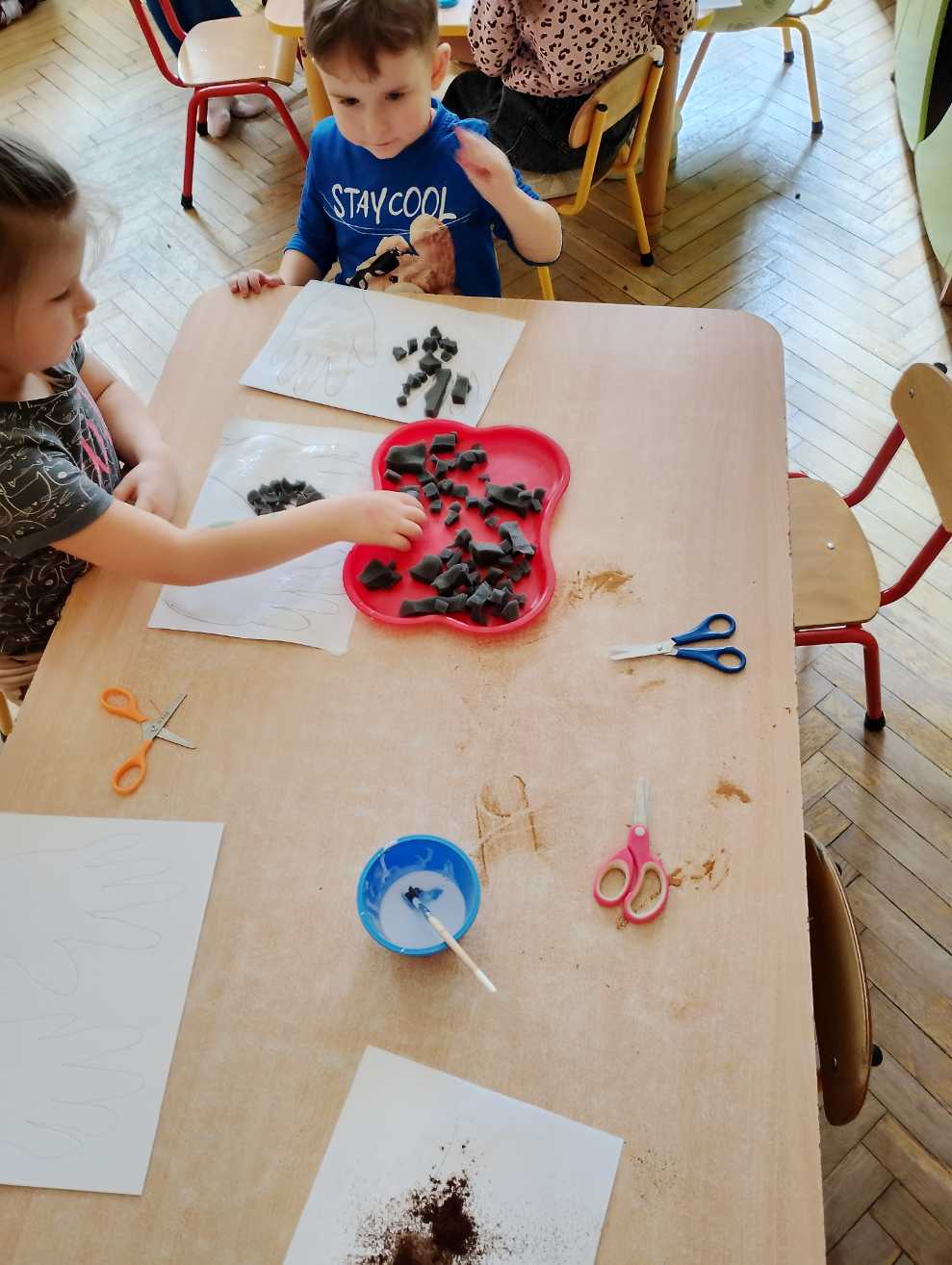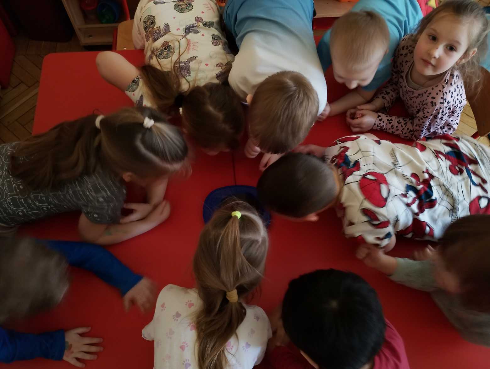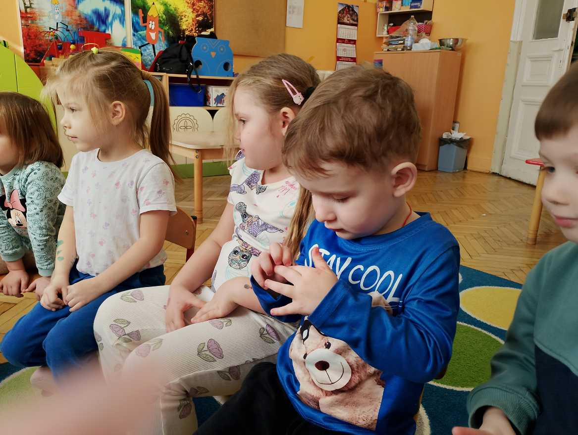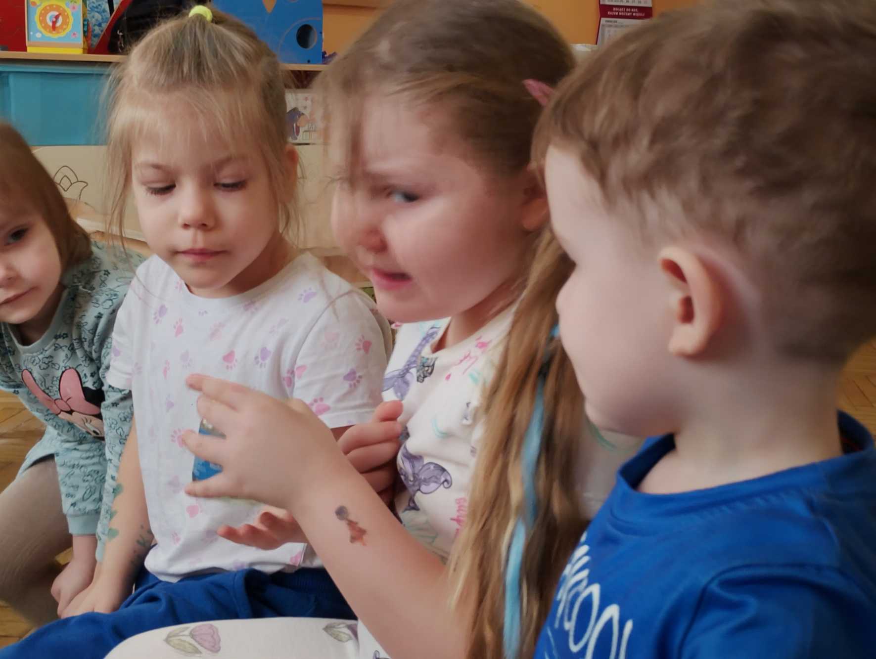 W tym tygodniu dzieci w grupie średniaków poznawały przedmioty 5 zmysłami (wzrok, słuch, smak, dotyk, węch). Bawiły się w poznawanie przedmiotów tylko za pomocą dotyku, opisując także właściwości rzeczy (miękki, twardy, szorstki, gładki). Ciocia Agnieszka przyniosła też przyprawy (cynamon, pieprz, kawa, sól) oprócz poznania ich za pomocą zmysłów, dzieci oglądały też eksperymenty przy użyciu tych przypraw. Dzieci by utrwalić temat wykonały prace plastyczną korzystając z pomponów, gąbki, bibuły oraz kawy i cynamonu.